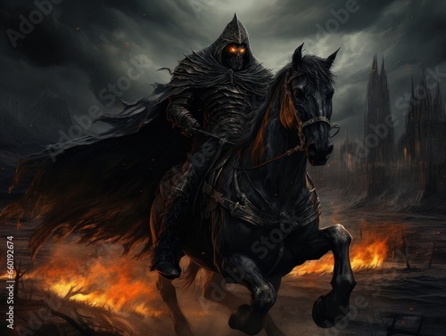Black horseman of the apocalypse riding black horse AI
