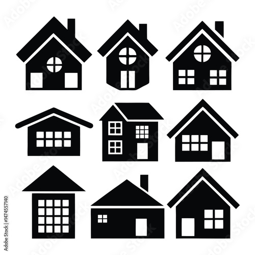 Black House Icon Set, Simple Residential Building Silhouettes.