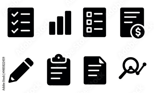Black icons for business: checklist, graph, list, and more
