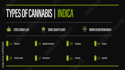 Black information poster of Types of cannabis with infographic. Indica