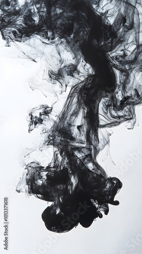 Black ink in water, creating an abstract background with smoke-like shapes on a white background