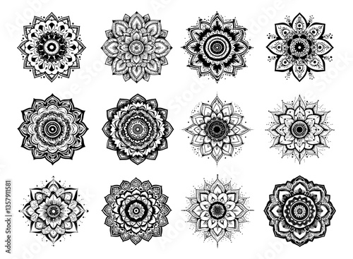Black ink sketch mandala. Sacred spiritual diagram, meditation flower yoga symbol, circle of life energy wheel geometric pattern, isolated vector illustrations