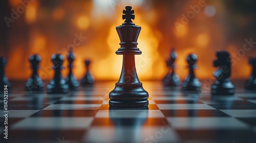 Black king chess piece stands out among other pieces on a chessboard against a blurred background.