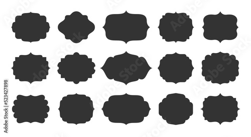 Black labels set, different geometric shape with ornamental border. Decorative vintage silhouette frame. Elegant blank label stickers, template for certificate, badge, menu, text dark background