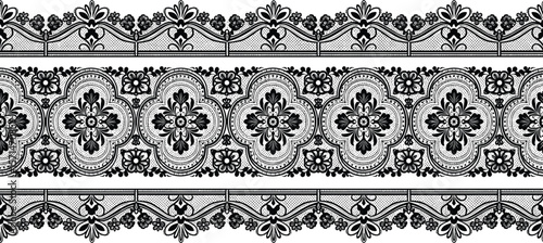 Black lace pattern sketch, horizontal decorative bands, floral medallions, scalloped edges, ornamental textile artwork, detailed fashion trim illustration