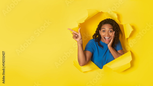 Black Lady Pointing Finger Aside At Torn Yellow Paper Background