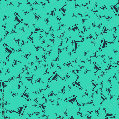 Black Lawn mower icon isolated seamless pattern on green background. Lawn mower cutting grass. Vector