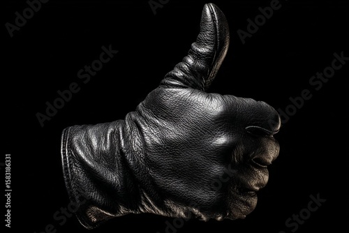 Black leather glove giving a thumbs up in a dark setting during evening hours