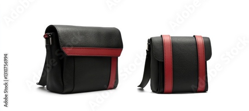 Black leather shoulder bag with a red stripe on a white background, front and back view