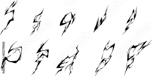 Black lightning silhouettes, thunderbolts. Earth ground, rock or floor cracks, vector cartoon illustration. Electric strikes, lightnings isolated on white background