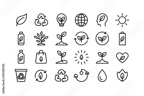 Black Line Eco Icons Set Recycling Leaf Plant Growth Energy Sun