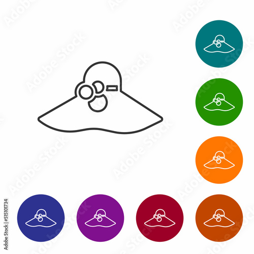 Black line Elegant women hat icon isolated on white background. Set icons in color circle buttons. Vector