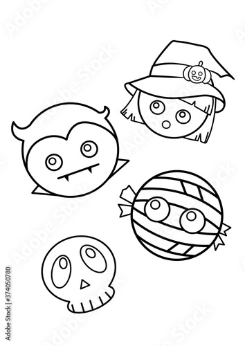Black line halloween elements, such as witch, dracula, mummy and skull. Hand drawn cute cartoon festival holiday. Doodle for coloring, decoration or any design. Vector illustration of kid.