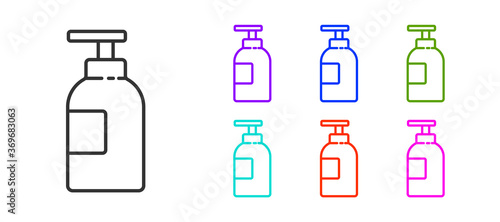 Black line Hand sanitizer bottle icon isolated on white background. Disinfection concept. Washing gel. Alcohol bottle for hygiene. Set icons colorful. Vector Illustration.