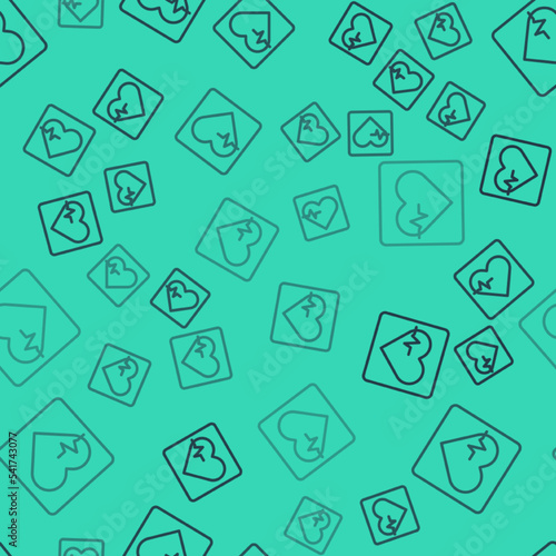 Black line Heart rate icon isolated seamless pattern on green background. Heartbeat sign. Heart pulse icon. Cardiogram icon. Vector