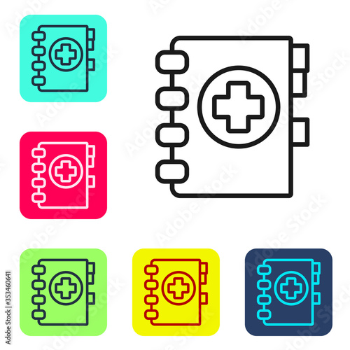 Black line Medical clipboard with clinical record icon isolated on white background. Prescription, medical check marks report. Set icons in color square buttons. Vector Illustration.