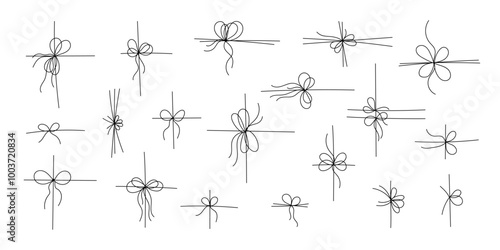 Black line style gift ribbon bows set isolated on white background. Doodle line style gift box ribbon bows in a thin, simple, minimal hand drawn design for elegant festive present decoration.