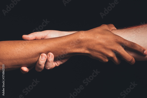 Black lives matter. Peace support. Closeup african caucasian male hands holding together isolated on dark. Racial friendship. Ethnic tolerance. No racism