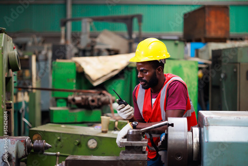 Black Male Engineer Working on machine in Factory. black man engineer checking Quality control the machine. Service and Maintenance of factory machinery. American African people.