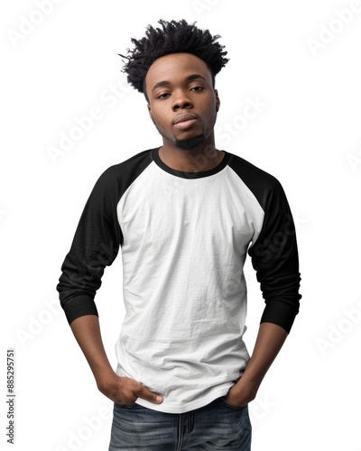 black male model with hands in pockets raglan shirt