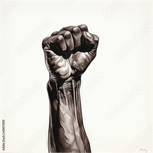 black man fist raised hand high in triumph, watercolor on a white backdrop