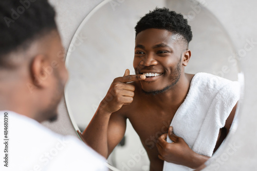 Black Man Looking At His Smile In Mirror In Bathroom