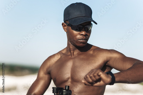 black man uses a fitness tracker to track progress, heart rate and calories burned during a workout