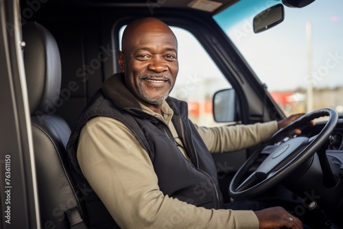 Black man working as a truck driver smiling sitting in the cab of the truck during a break in his travel route, copy space right. Truck drivers and road work.
