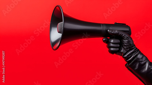 Black Megaphone Held Like a Gun by a Gloved Hand Against a Red Background