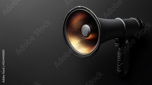 Black megaphone with orange speaker on black background.