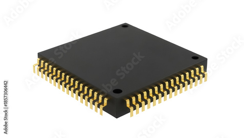 Black microchip with golden pins isolated PNG, integrated circuit component for electronics and computer hardware design on transparent background