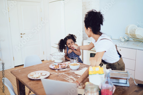 Black mom playing with kid while cooking