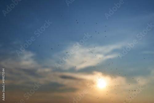 Black mosquitoes against blue sky in the evening. Yellow sun sets behind the little clouds. Insects in the air. Germany.