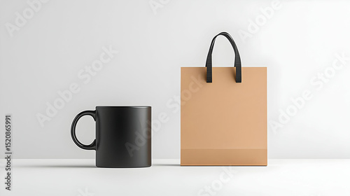 Black Mug And Brown Paper Bag Mockup On White Surface