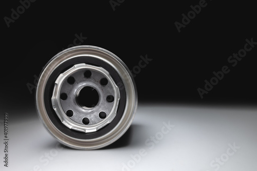 Black new oil filter in contrasting light on a black and white background. Wide angle