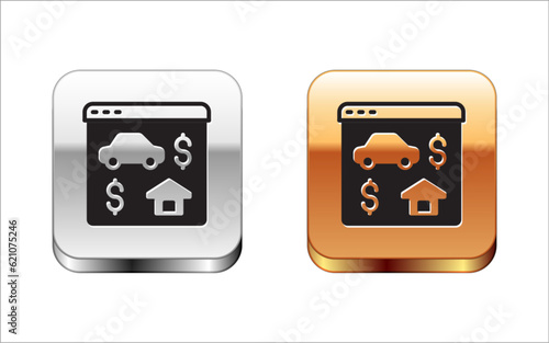 Black Online real estate house in browser icon isolated on white background. Home loan concept, rent, buy, buying a property. Silver and gold square buttons. Vector