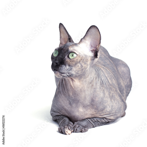 Black or blue canadian sphynx cat with green eyes isolated on a