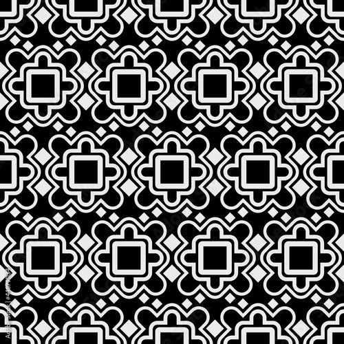 Black ornamental shapes pattern. Vector seamless wallpaper sample.