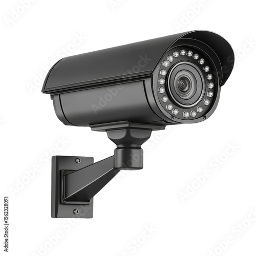 Black outdoor security camera with infrared LEDs mounted on an adjustable wall bracket for surveillance, isolated on white background, transparent background.