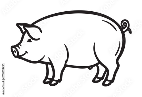 Black outline drawing of a large pig with a curly tail facing left, featuring distinct features like ears and hooves.
