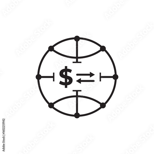 Black outline icon of a globe with a dollar sign and arrows, symbolizing wire transfer or global money exchange. Ideal for finance, fintech, remittance, or banking services.
