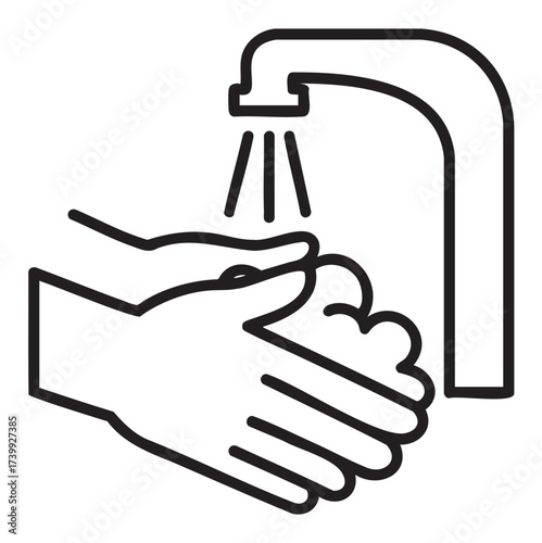 Black outline icon of hands being washed under a tap with soap lather, illustrating the concept of hygiene and cleanliness.
