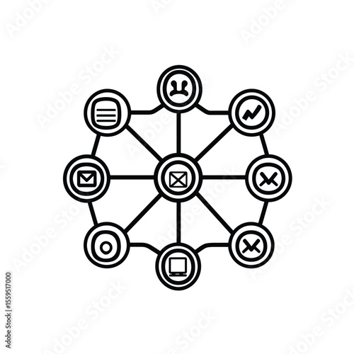 Black Outline Network Diagram with Communication Symbols Isolated on a White Background