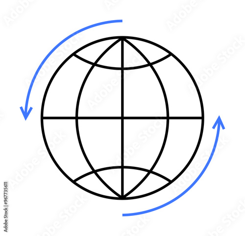 Black outline of the Earth with two blue arrows rotating around it, representing global connectivity. Ideal for themes international communication, travel, technology, networking, geography. Simple
