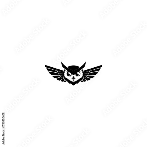 Black owl with wings, two yin yang symbols in eyes, centered on white background