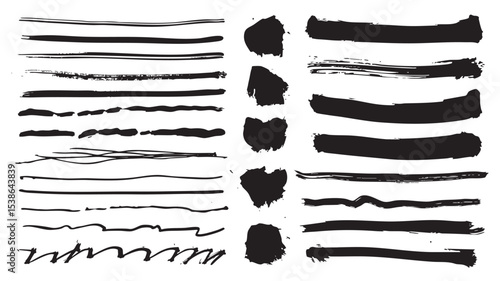 Black paint brush strokes set. Collection of paintbrush smears of scribble lines and long stripes, dirty rectangle shape stains with ink splatters texture. Acrylic rough borders. Vector illustration.