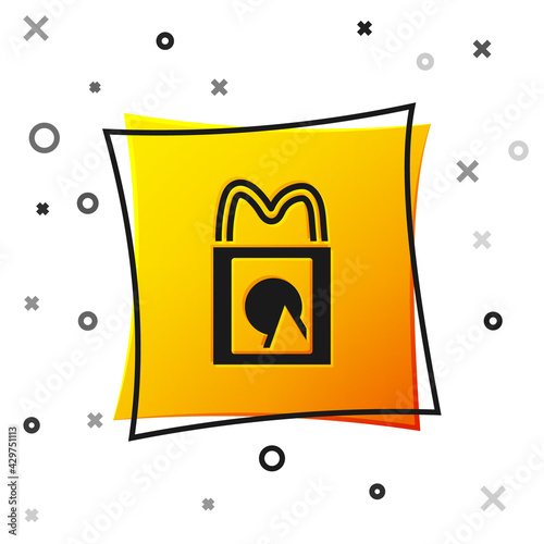 Black Paper shopping bag icon isolated on white background. Package sign. Yellow square button. Vector