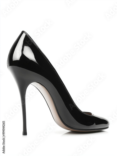 Black Patent Leather Stiletto High Heel Shoe, Elegant Fashion Footwear on White Background