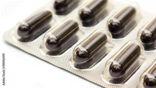 Black pill capsule on a white background., selective focus.