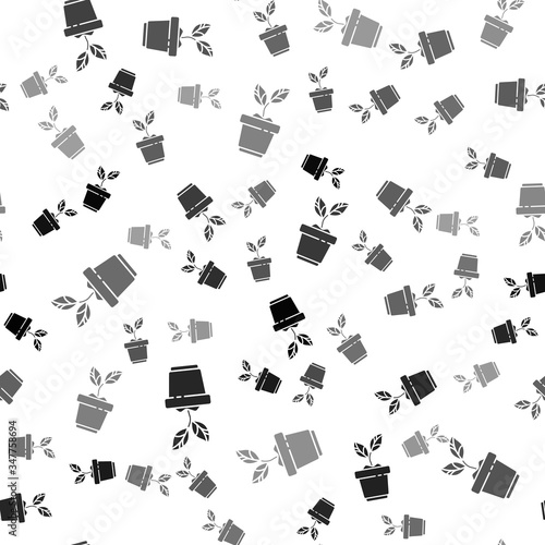 Black Plant in pot icon isolated seamless pattern on white background. Plant growing in a pot. Potted plant sign. Vector Illustration